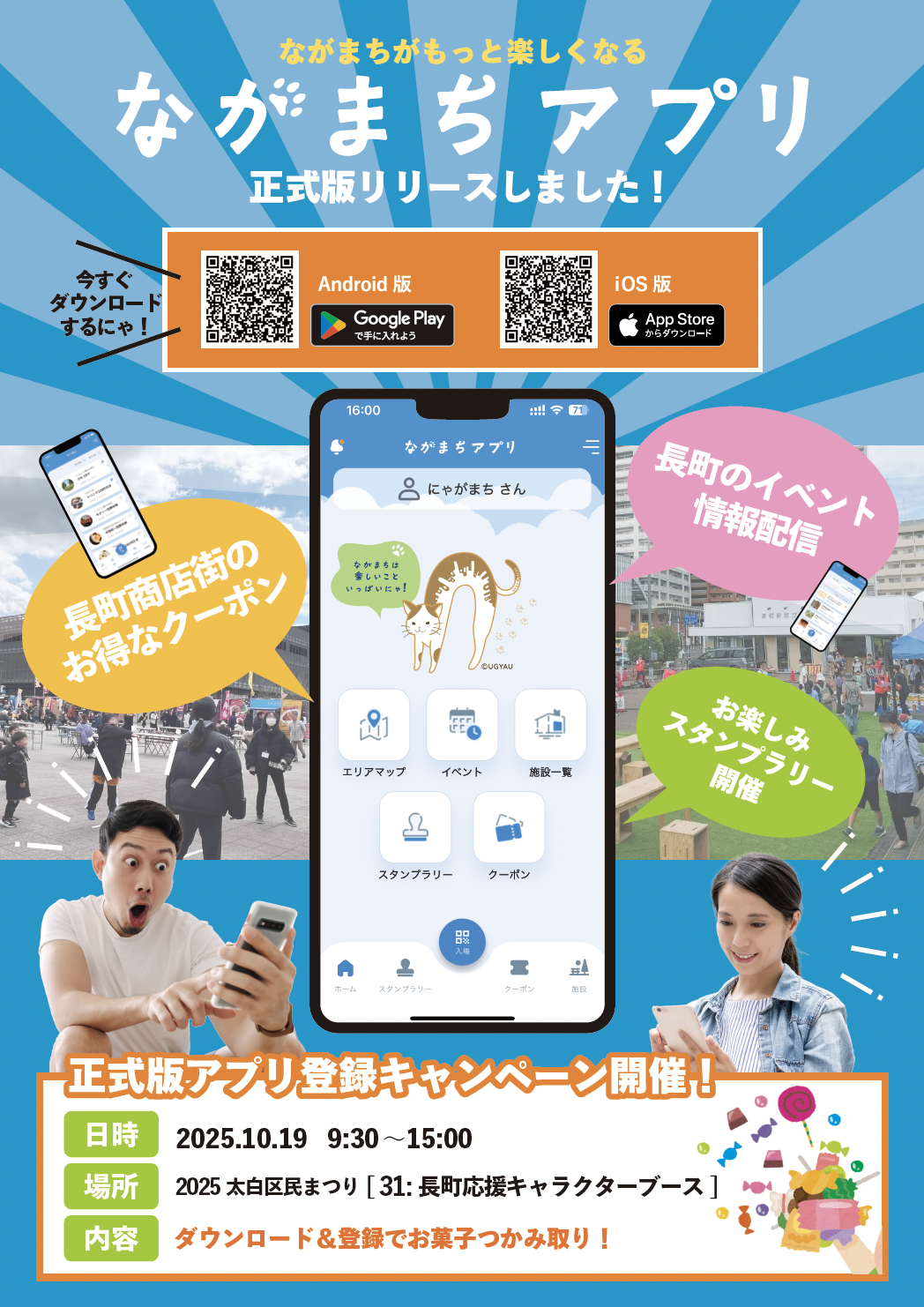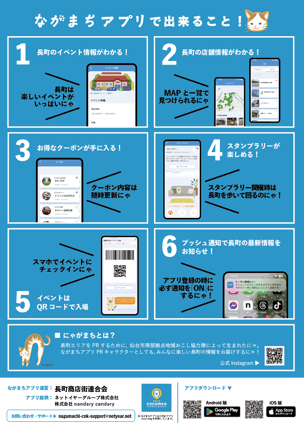 これからはプッシュ通知やアプリ内の案内で、みんなにながまちの楽しい情報を頑張ってお知らせしていくにゃ!